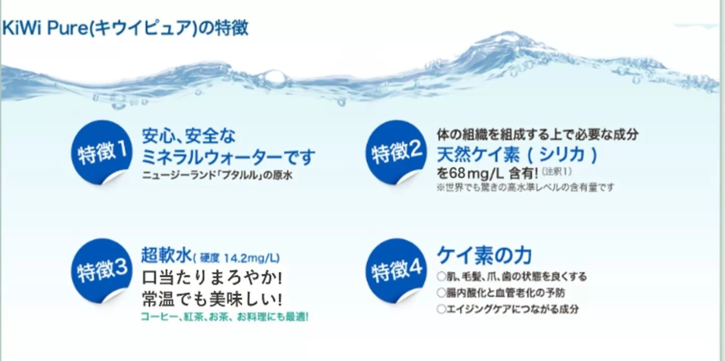 カラダの大部分を占めているのは「水分」です。毎日摂取する「水」だからこそ、毎日の蓄積が、あなたのカラダに影響を及ぼします。安全で、安心できる「水」を飲むこと=健康を維持する最大の健康促進!であると言えます。「KiWi Pure」キウイピュアは、環境汚染のない「ニュージーランド」の原泉から採取し、天然ケイ素 ( シリカ ) を豊富に含んだ安全安心の究極の「天然ミネラルウォーター」です。